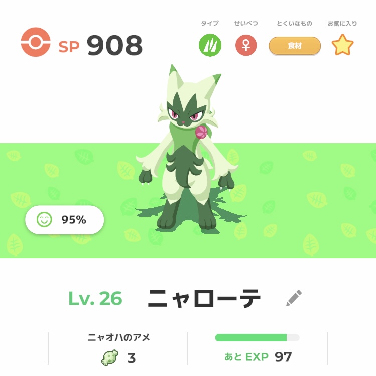 というわけでいい感じのニャオハを育て始めて、マスカーニャにしたいけど今週湖畔にいるからきのみの関係でニャローテの方が都合がいいかな?ってまだ進化止めてる